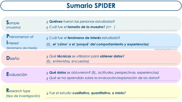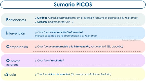 Sumarios PICOS y SPIDER: son muy útiles para buscar estudios en bases de datos de literatura científica, crear protocolos de investigación y ayudarnos a estudiar. El sumario PICOS se utiliza para la investigación cuantitativa y significa:
