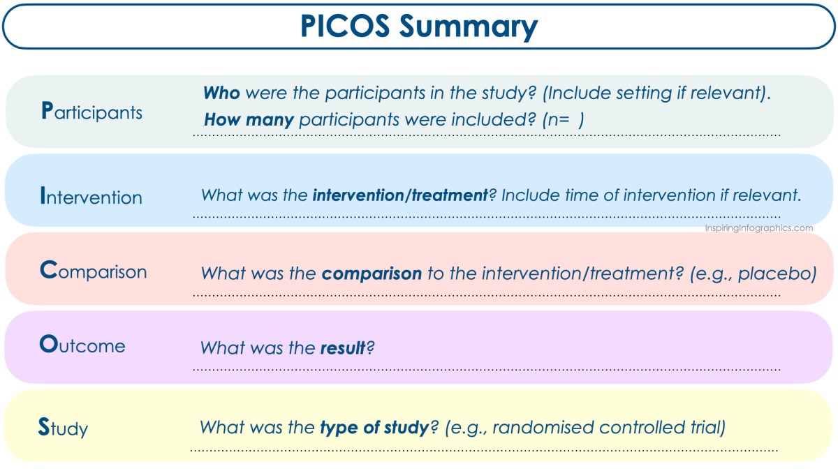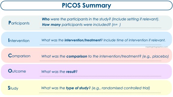 O – Outcome: is the result of the study.S – Study: specify the type of study, for example whether it was a randomised controlled trial, a longitudinal study, etc.T