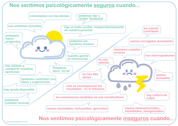 Seguridad psicológica: la definición de seguridad psicológica fue desarrollada por Kahn en 1990, como la capacidad de ‘emplearse o expresarse física, cognitiva y emocionalmente’. Más tarde, en 1999, después de investigar el rendimiento en equipos clínicos, Edmonson llegó a la siguiente definición: ‘una creencia compartida por los miembros de un equipo de que el equipo es seguro para asumir riesgos interpersonales’. Más recientemente, en 2019, Clark sugirió un modelo con cuatro etapas para progresar hacia la seguridad psicológica: