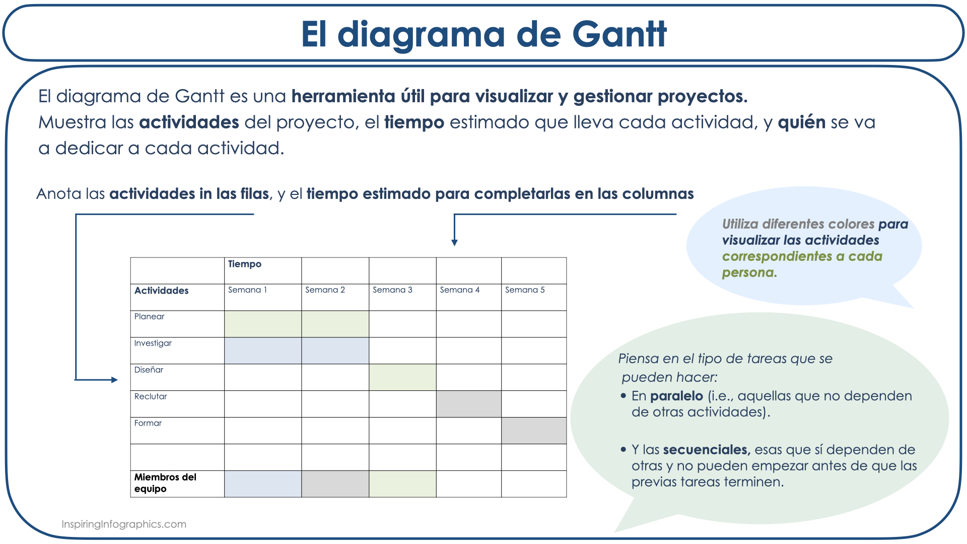 Para visualizar y gestionar proyectos, una herramienta que resulta muy útil es el diagrama de Gantt. Este diagrama es capaz de mostrar todas las actividades del proyecto, si hay una relación entre ellas, el tiempo estimado que lleva cada actividad, y quién se va a dedicar a cada actividad.