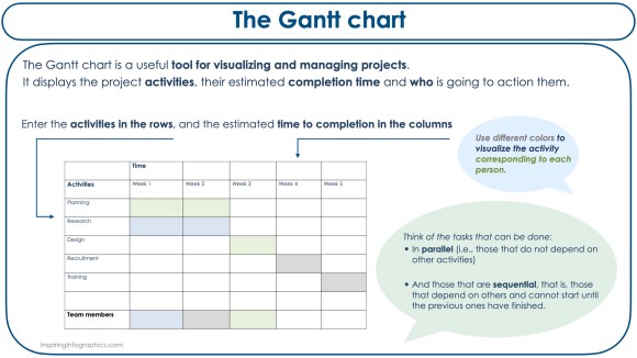 A very useful tool for visualizing and managing projects is the Gantt chart. This chart is able to display all the activities of a project, whether there is a relationship between them, the estimated time that each activity will take, and who is going to perform each activity.